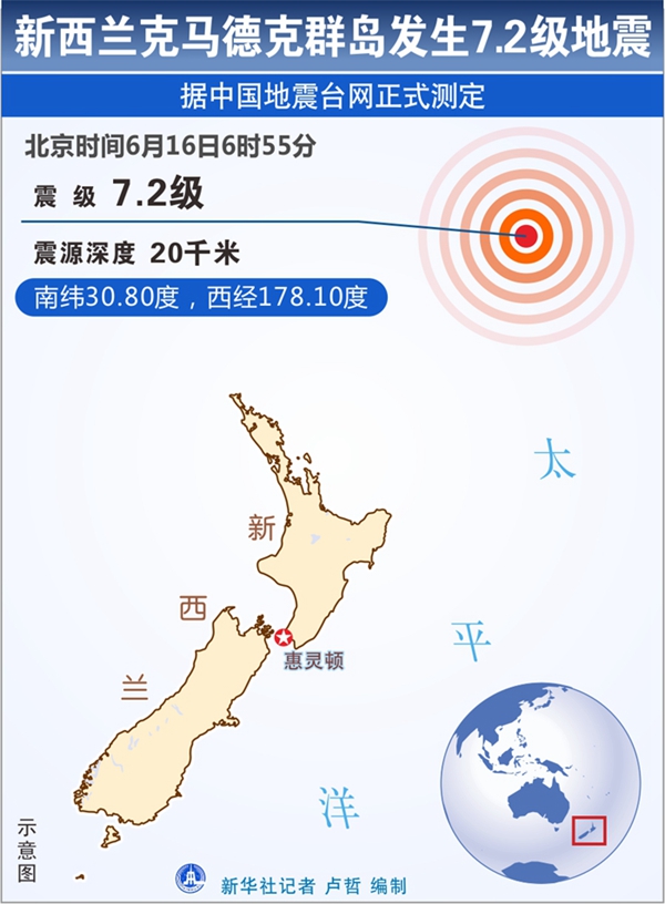 新華社快訊:中國地震臺網(wǎng)正式測定,6月16日6時55分,在新西蘭克馬德克群島(南緯30.8度,西經(jīng)178.1度)發(fā)生7.2級地震,震源深度20公里。
