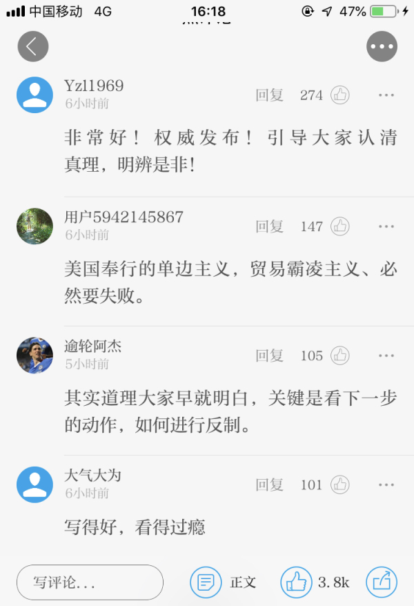 文章刊發(fā)后,網(wǎng)友紛紛轉(zhuǎn)發(fā)、點贊,表示“全面、清晰且深刻?!薄皺?quán)威發(fā)布!引導(dǎo)大家認(rèn)清真理,明辨是非!”“美國奉行的單邊主義,貿(mào)易霸凌主義、必然要失敗。 ”