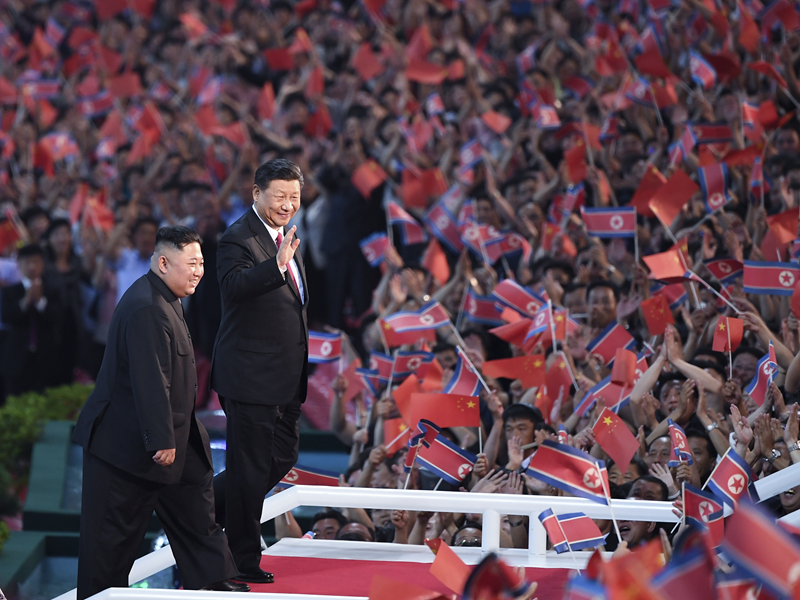 演出在以“朝中友誼萬古長青”為主題的大型歌舞表演中結(jié)束。習(xí)近平和金正恩同全場(chǎng)觀眾一起站立,為藝術(shù)家和演員們的精湛表演送上經(jīng)久不息的掌聲。