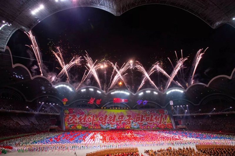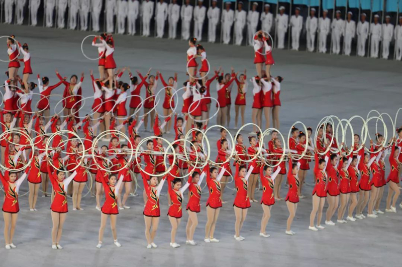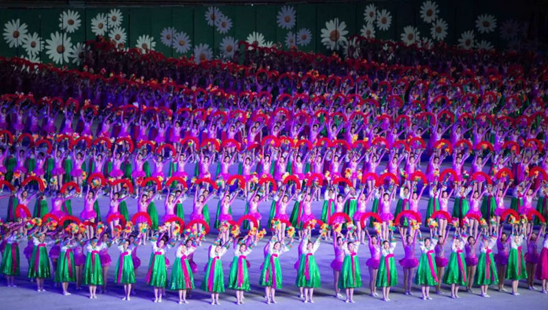 平壤大同江畔,綾羅島“五一”體育場(chǎng)是團(tuán)體操的主要舞臺(tái)。演出以朝鮮民族獨(dú)特的“歌舞之美”、富有活力的團(tuán)體操、嘆為觀止的雜技表演,展現(xiàn)出朝鮮革命與戰(zhàn)爭、政治和軍隊(duì)建設(shè)、民生與經(jīng)濟(jì)發(fā)展以及對(duì)外交往的宏偉畫卷。