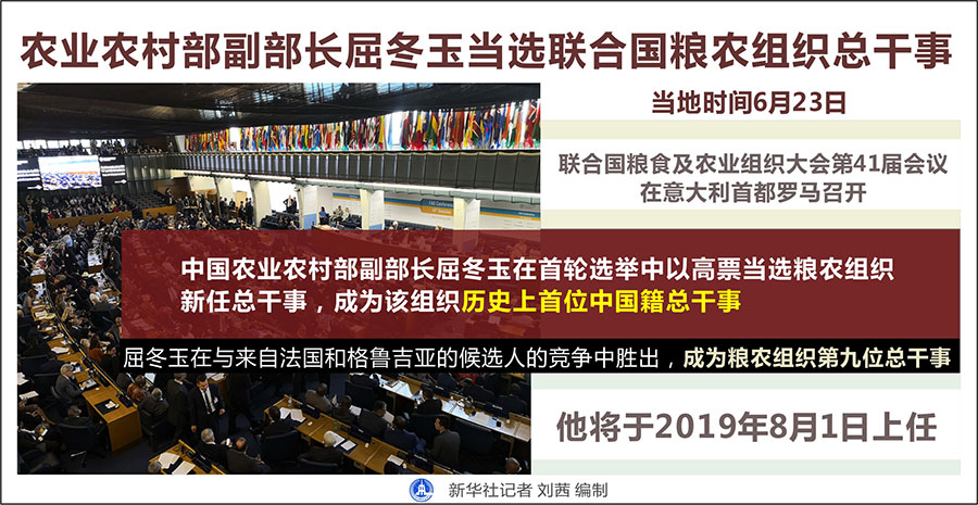 當(dāng)日,屈冬玉在與來自法國和格魯吉亞的候選人的競(jìng)爭(zhēng)中勝出,成為糧農(nóng)組織第九位總干事。他將于今年8月1日上任。