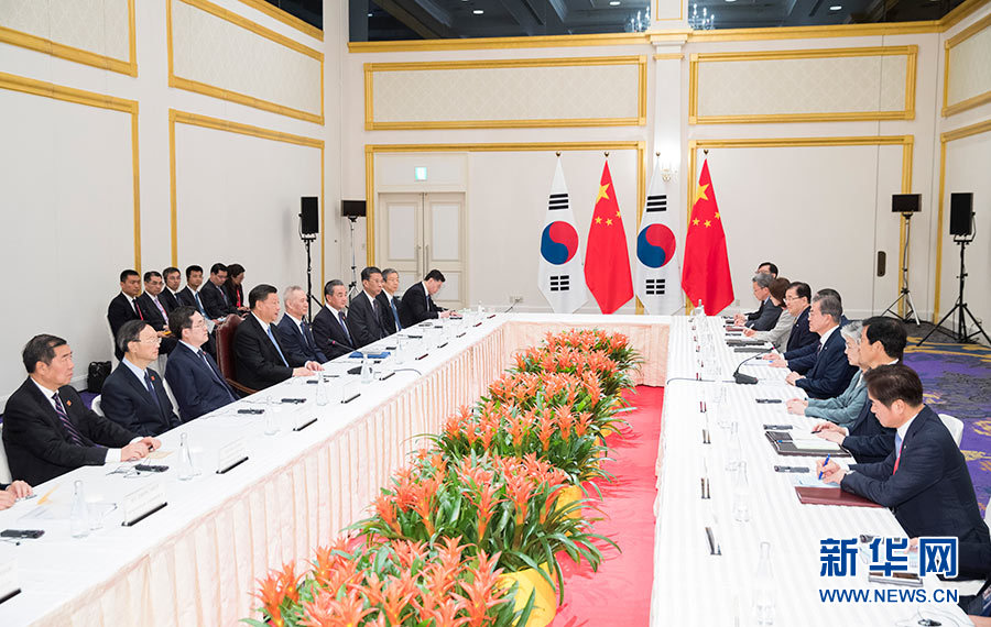 習(xí)近平指出,加強中韓友好合作符合歷史潮流,也是兩國人心所向。中方愿同韓方堅持以誠相待,努力實現(xiàn)合作共贏,推動兩國關(guān)系不斷向前發(fā)展,并為朝鮮半島和地區(qū)和平穩(wěn)定作出貢獻。雙方要保持各層次溝通,把穩(wěn)雙邊關(guān)系發(fā)展大方向。要把握共建“一帶一路”機遇,加快中韓自由貿(mào)易協(xié)定第二階段談判,不斷擴大貿(mào)易、科技、財經(jīng)、環(huán)保等領(lǐng)域合作。要積極開展人文交流,鞏固中韓民間友好。中韓合作完全是互利雙贏的,不應(yīng)該受到外部壓力影響。希望韓方繼續(xù)重視、妥善處理好兩國間有關(guān)問題。雙方要加強在聯(lián)合國、二十國集團等多邊框架內(nèi)的協(xié)調(diào),共同反對保護主義,支持多邊主義和自由貿(mào)易體制,推動構(gòu)建開放型世界經(jīng)濟。