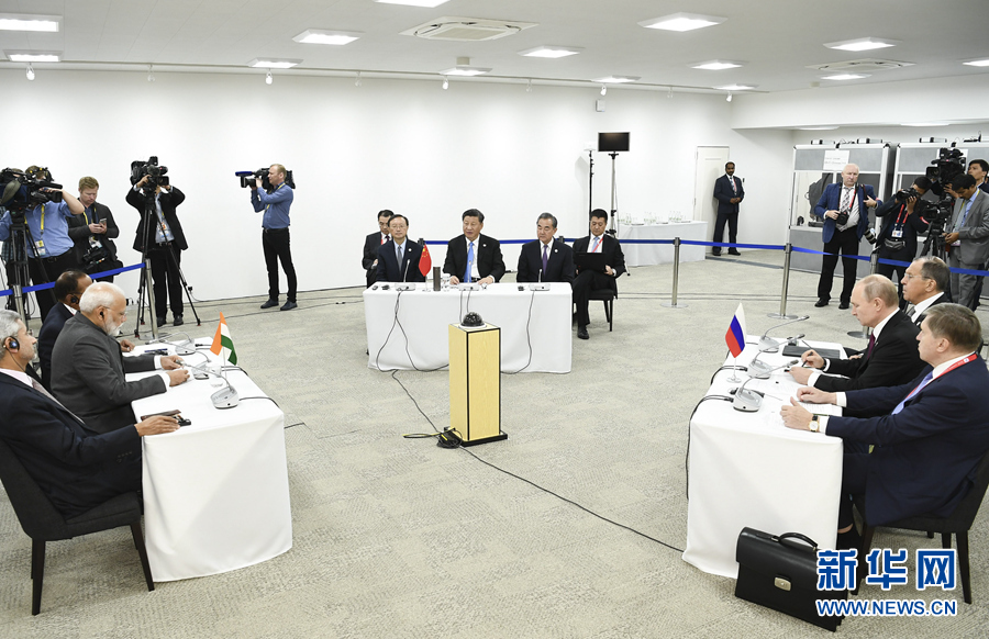 6月28日,國家主席習(xí)近平在大阪出席中俄印領(lǐng)導(dǎo)人會(huì)晤,同俄羅斯總統(tǒng)普京、印度總理莫迪就當(dāng)前國際形勢、重大國際和地區(qū)問題、三方合作深入交換意見。 新華社記者 謝環(huán)馳 攝