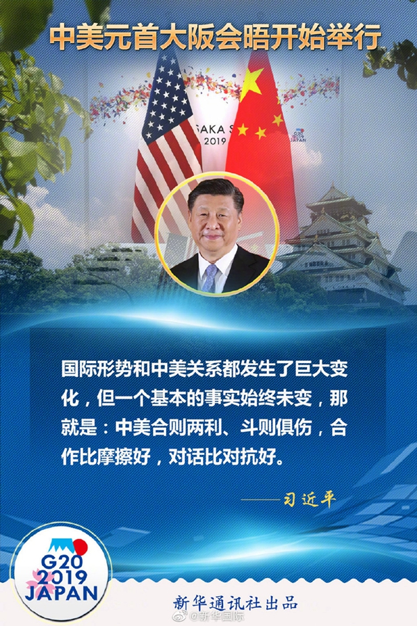 習(xí)近平在會晤開始時說,很高興同總統(tǒng)先生在大阪見面。48年前,也就是1971年,就在離這里100多公里的名古屋,參加第三十一屆世界乒乓球錦標賽的中美乒乓球運動員進行了友好互動,這就是后來人們說的“乒乓外交”的開啟,創(chuàng)造了“小球轉(zhuǎn)動大球”的歷史佳話。8年之后的1979年,中美建立了外交關(guān)系?;仡櫧ń灰詠淼?0年,國際形勢和中美關(guān)系都發(fā)生了巨大變化,但一個基本的事實始終未變,那就是:中美合則兩利、斗則俱傷,合作比摩擦好,對話比對抗好。近來,我同總統(tǒng)先生通過電話和書信保持著密切聯(lián)系。今天,我愿同總統(tǒng)先生就事關(guān)中美關(guān)系發(fā)展的根本性問題交換意見,為下階段兩國關(guān)系發(fā)展定向把舵,推進以協(xié)調(diào)、合作、穩(wěn)定為基調(diào)的中美關(guān)系。