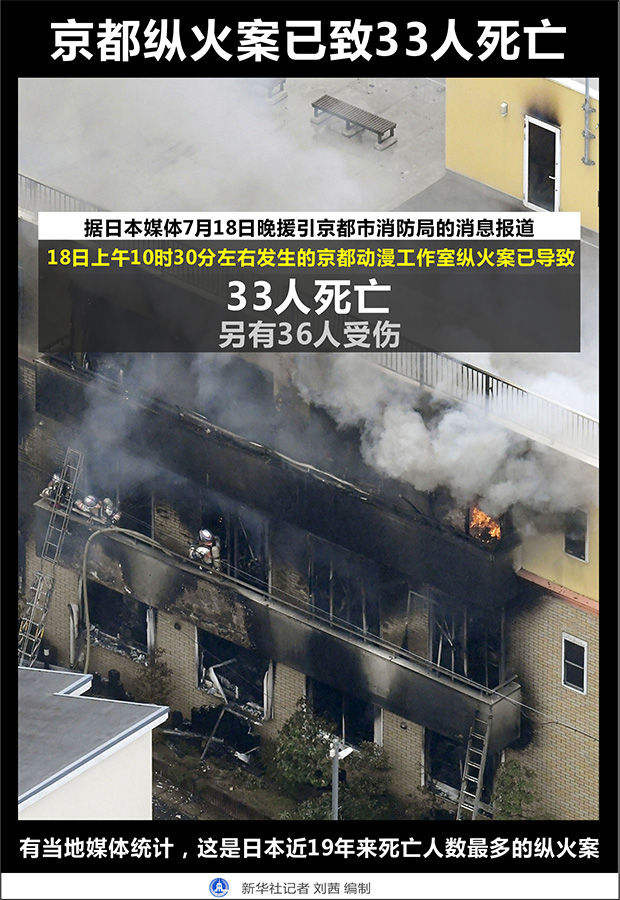 18日上午發(fā)生在日本京都動(dòng)畫第一工作室的縱火案造成嚴(yán)重傷亡。據(jù)日本共同社報(bào)道,目前已確認(rèn)33人死亡、36人受傷。有當(dāng)?shù)孛襟w統(tǒng)計(jì),這是日本近19年來死亡人數(shù)最多的縱火案。