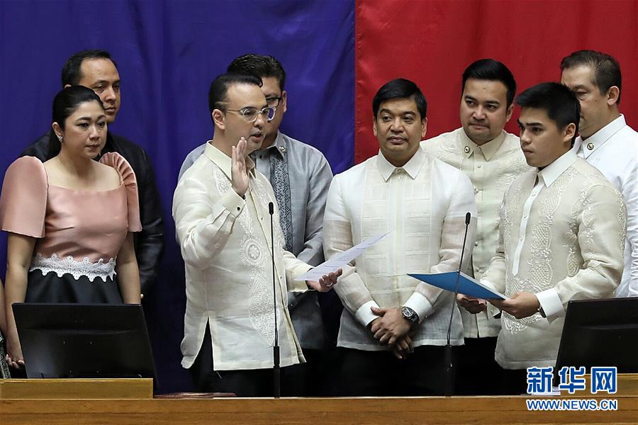 7月22日,在菲律賓大馬尼拉地區(qū)的奎松城,艾倫·彼得·卡耶塔諾(左三)宣誓就職新一任菲律賓眾議長。新華社發(fā)