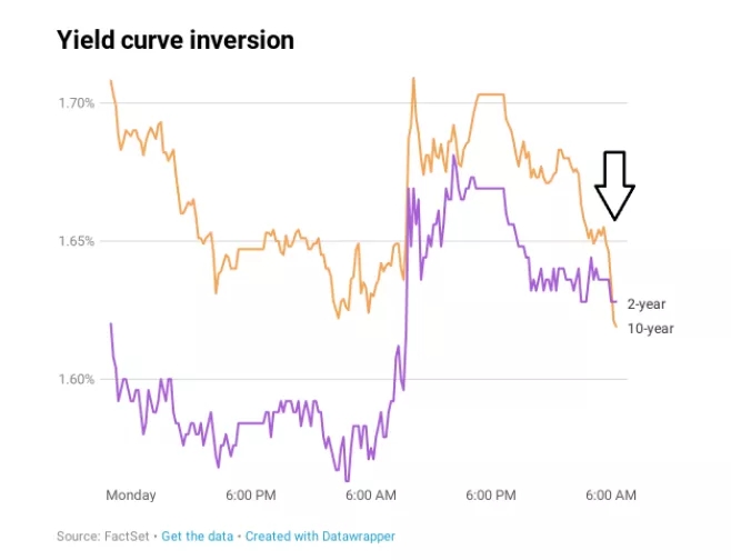 一般說來,國債期限越長收益率越高,因此短期國債收益率通常低于長期國債收益率;如果長期國債收益率降至短期國債收益率以下,這種反?,F象被稱為收益率曲線“倒掛”,一般被視為經濟在未來12個月可能步入衰退的預警信號。上次出現這一現象時正值2007年美國次貸危機發(fā)酵。過去50年以來,美國歷次經濟衰退發(fā)生之前也都出現過國債收益率倒掛的現象。