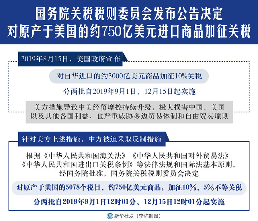 針對美方上述措施,中方被迫采取反制措施。根據(jù)《中華人民共和國海關法》《中華人民共和國對外貿(mào)易法》《中華人民共和國進出口關稅條例》等法律法規(guī)和國際法基本原則,經(jīng)國務院批準,國務院關稅稅則委員會決定,對原產(chǎn)于美國的5078個稅目、約750億美元商品,加征10%、5%不等關稅,分兩批自2019年9月1日12時01分、12月15日12時01分起實施。