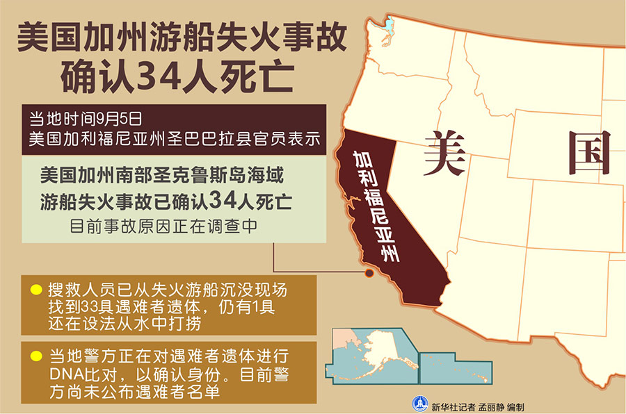 美國加州游船失火事故確認34人死亡-新華網(wǎng)