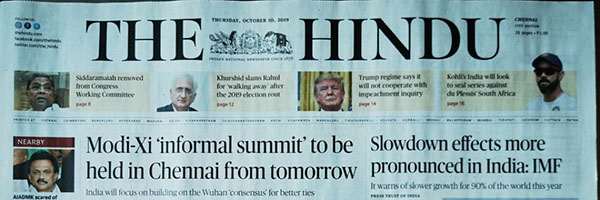 10日清晨6時(shí),當(dāng)天的《印度教徒報(bào)》已送抵讀者手中。頭條為兩國(guó)領(lǐng)導(dǎo)人非正式會(huì)晤將于明日起在金奈舉行的消息。
