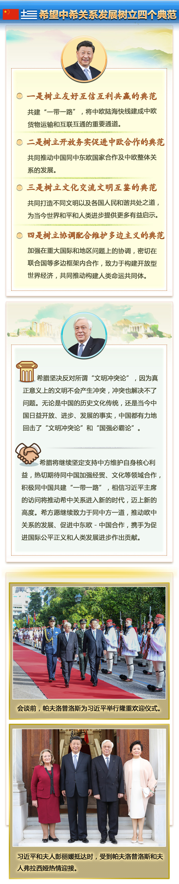 新華社雅典11月12日電 國家主席習(xí)近平11月10日晚抵達雅典,開始對希臘進行國事訪問。11日上午,習(xí)主席的訪問活動異常密集:向希臘無名戰(zhàn)士紀(jì)念碑獻花圈,出席希臘總統(tǒng)帕夫洛普洛斯舉行的隆重歡迎儀式并同帕夫洛普洛斯舉行會談,旋即又同總理米佐塔基斯舉行會談、出席合作文本交換儀式、共同會見記者。中希兩國領(lǐng)導(dǎo)人就雙邊關(guān)系及共同關(guān)心的國際和地區(qū)問題深入交換意見,達成廣泛共識。