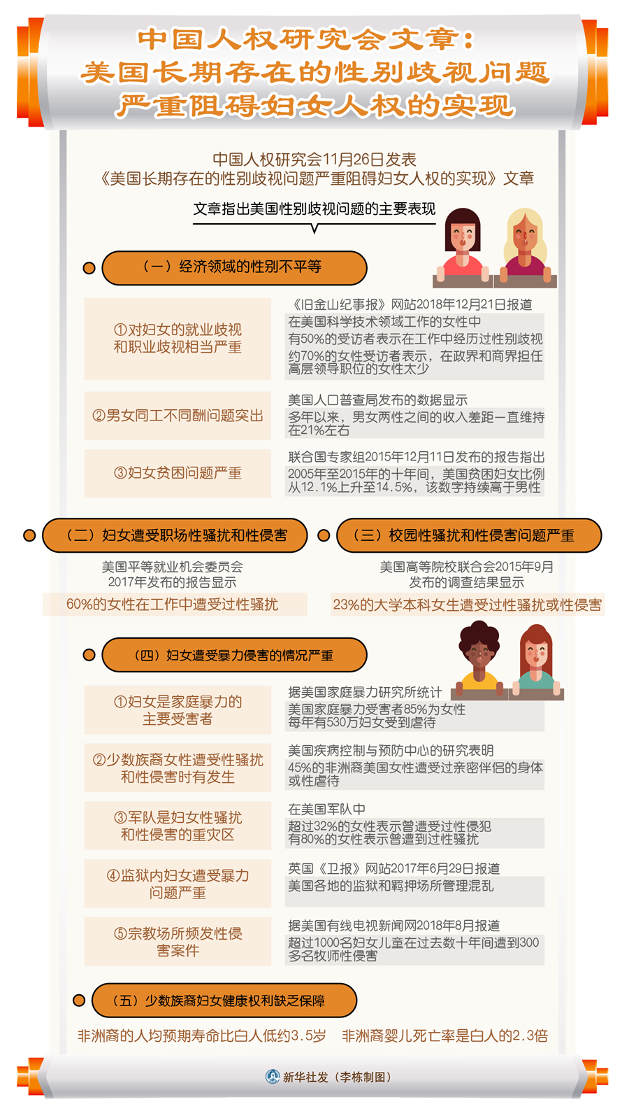 新華社北京11月26日電 中國人權研究會26日發(fā)表《美國長期存在的性別歧視問題嚴重阻礙婦女人權的實現(xiàn)》文章。全文如下: