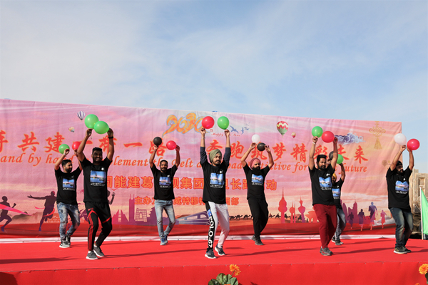 1月1日,在科威特杰赫拉省,葛洲壩集團外國員工在長跑活動開幕式上表演舞蹈。聶云鵬攝
