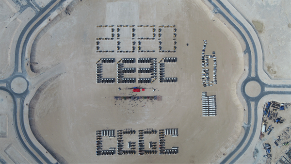 當天上午,在主題為“攜手共建‘一帶一路’,奔跑筑夢精彩未來”的長跑活動開幕式現(xiàn)場,由240多輛卡車、挖掘機、平地機等車輛設備擺出的2020、CEEC(中國能建英文縮寫)、CGGC(葛洲壩集團英文縮寫)字樣排布在沙漠上,氣勢壯觀。