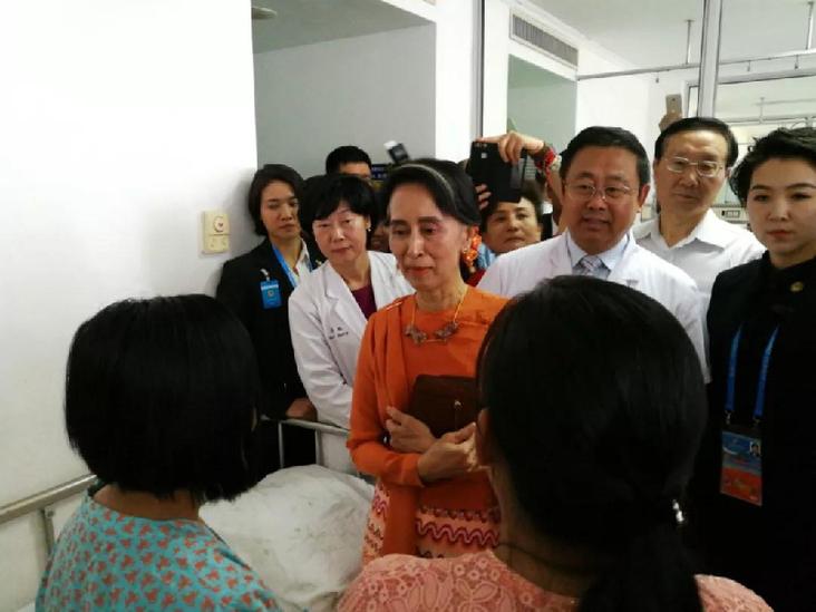 ▲2017年5月16日,緬甸國務資政昂山素季來到北京安貞醫(yī)院看望受救助在京做手術的緬甸先心病患兒。她在北京出席首屆“一帶一路”國際合作高峰論壇。新華社記者李雪笛攝