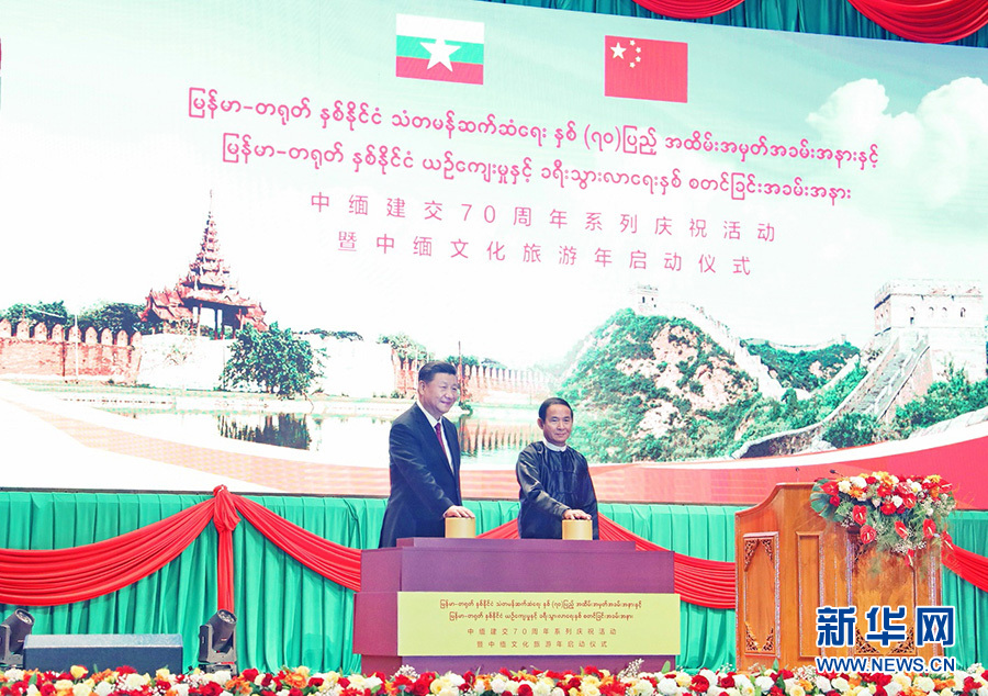 新華社內(nèi)比都1月17日電(記者霍小光 李忠發(fā) 駱珺)當(dāng)?shù)貢r(shí)間1月17日晚,國家主席習(xí)近平在內(nèi)比都第二國際會(huì)議中心出席中緬建交70周年慶?;顒?dòng)暨中緬文化旅游年啟動(dòng)儀式。緬甸總統(tǒng)溫敏、國務(wù)資政昂山素季、緬甸第一副總統(tǒng)敏瑞、第二副總統(tǒng)亨利班提育、聯(lián)邦議會(huì)議長兼人民院議長蒂昆密、民族院議長曼溫凱丹、國防軍總司令敏昂萊、全體內(nèi)閣成員等出席。