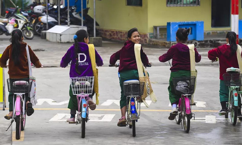 ▲國境線將云南省瑞麗市姐相鄉(xiāng)一個村寨一分為二,中方一側(cè)稱銀井,緬方一側(cè)稱芒秀,是典型的“一寨兩國”村落。圖為銀井小學幾位緬籍學生騎車回家,跨過銀井邊防口岸國境線。