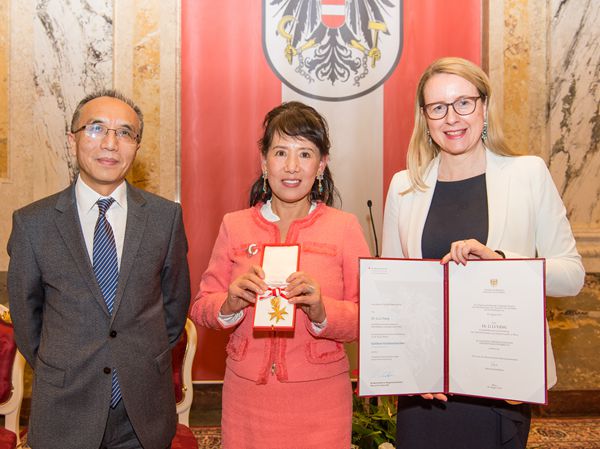 楊麗博士是2002年來第一位獲此殊榮的華人,也是獲得此項(xiàng)勛章的第一位華人女性。奧地利經(jīng)濟(jì)部長瑪加麗特·施拉姆伯克親自向她頒發(fā)勛章和榮譽(yù)證書。中國駐奧地利大使李曉駟出席頒獎(jiǎng)儀式。
