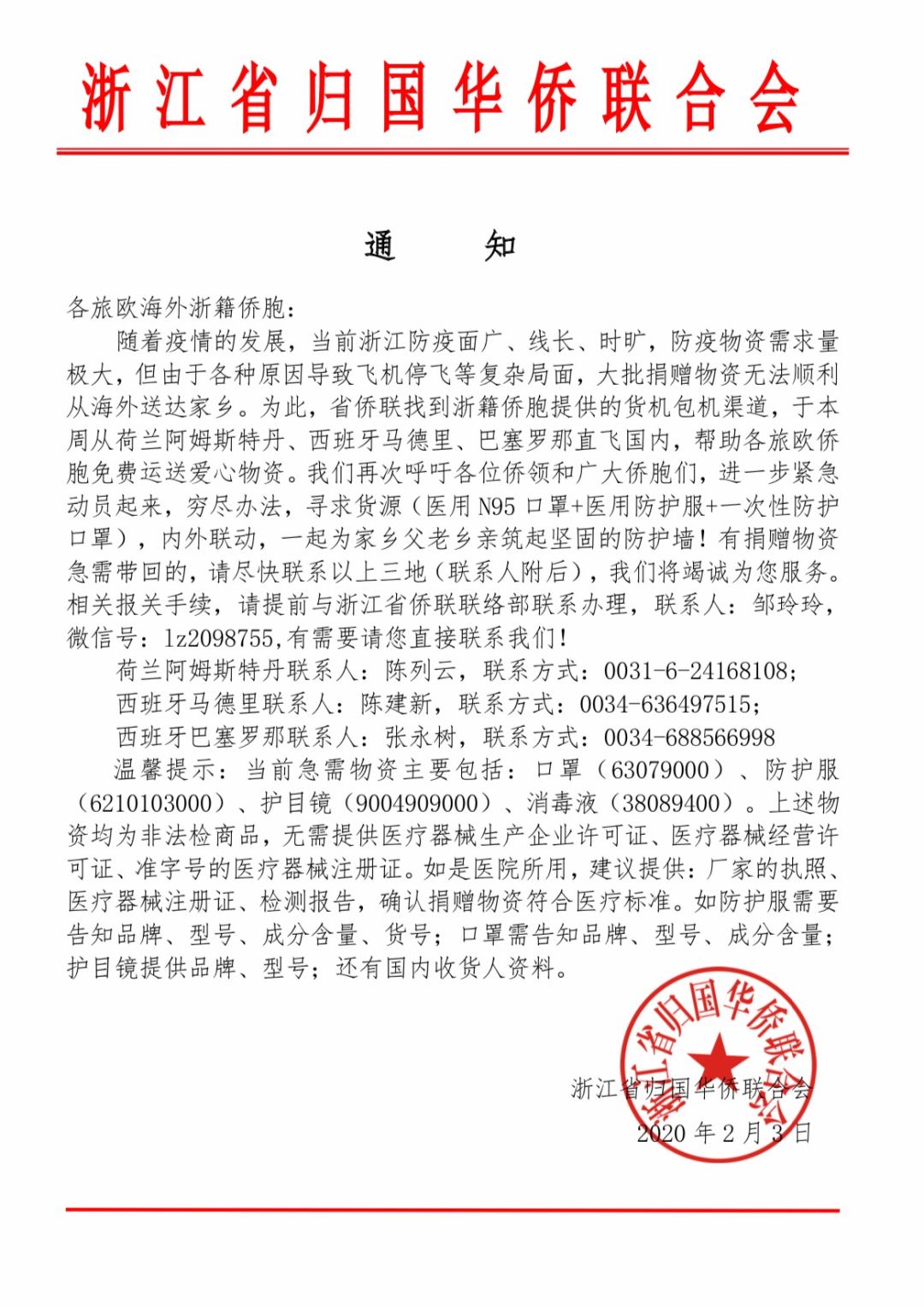 大疫當前爭分奪秒。2月3日,一則浙江省歸國華僑聯(lián)合會聯(lián)系貨運包機直飛國內(nèi)尋求抗疫捐贈物資的通知,將眾多歐洲華僑華人凝聚在一起。