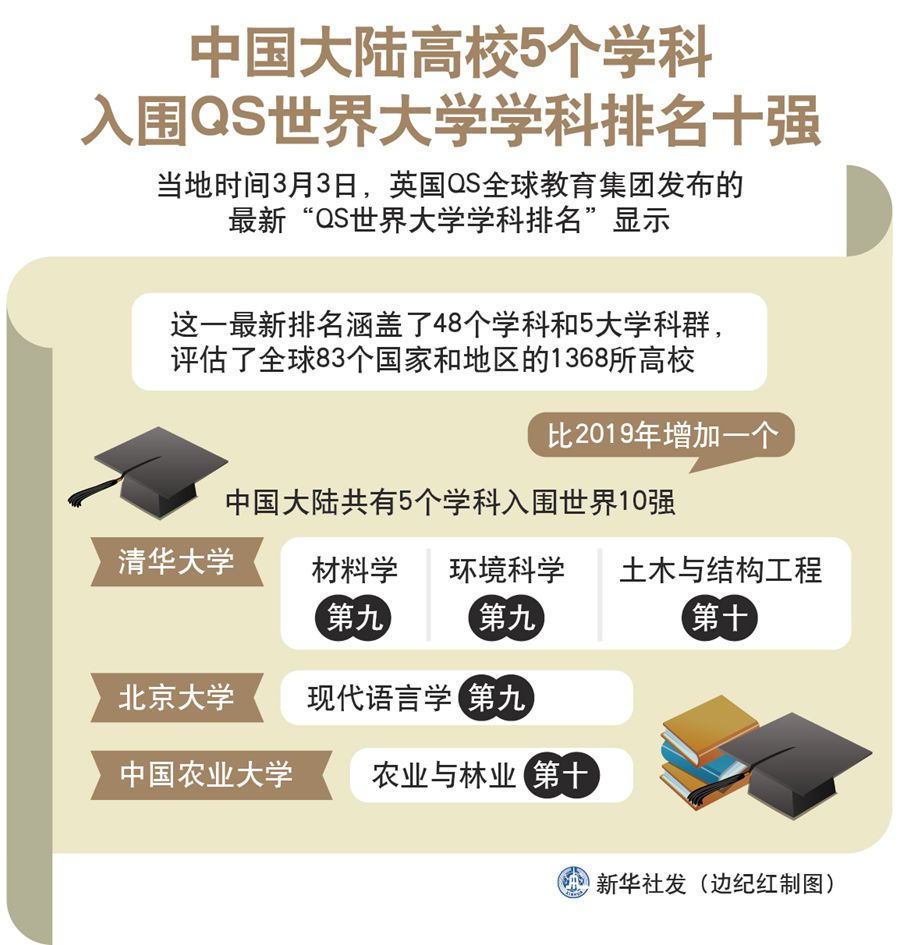 新華社倫敦3月3日電(記者梁希之)英國QS全球教育集團(tuán)3日發(fā)布的最新“QS世界大學(xué)學(xué)科排名”顯示,中國大陸3所大學(xué)的5個學(xué)科入圍世界10強(qiáng)、18所大學(xué)的100個學(xué)科進(jìn)入世界50強(qiáng)。