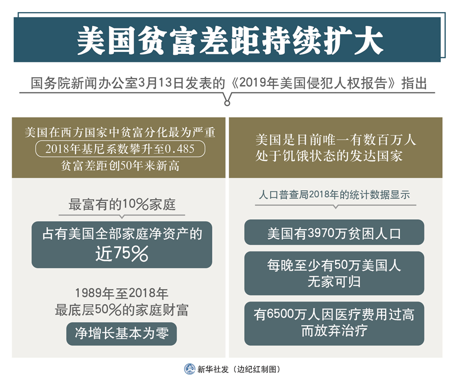 新華社北京3月13日電(記者王子銘、李超)國務(wù)院新聞辦13日發(fā)表的《2019年美國侵犯人權(quán)報告》指出,美國國民收入分配差距持續(xù)擴大,底層民眾生活苦不堪言。