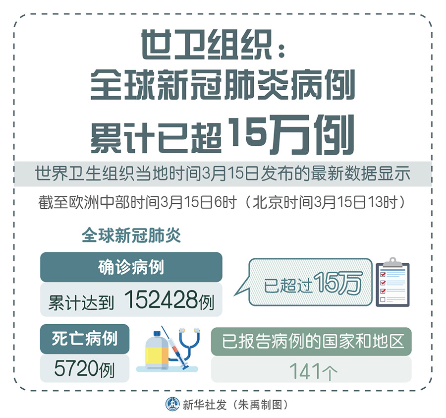 數(shù)據(jù)顯示,截至歐洲中部時(shí)間15日6時(shí)(北京時(shí)間15日13時(shí)),全球新冠肺炎確診病例累計(jì)達(dá)到152428例,死亡病例5720例,已報(bào)告病例的國家和地區(qū)達(dá)141個(gè)。
