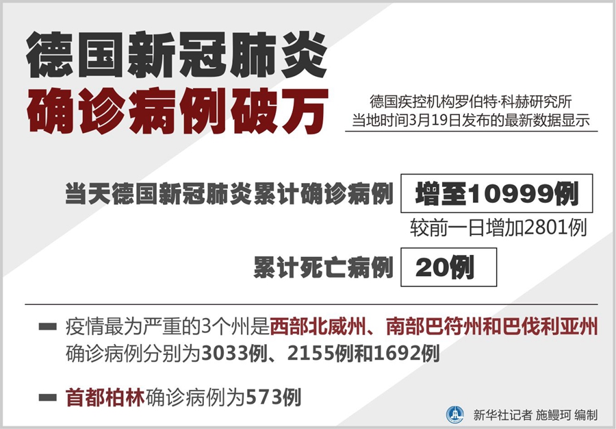新華社柏林3月19日電(記者張毅榮 田穎)德國疾控機構羅伯特·科赫研究所19日發(fā)布的最新數(shù)據(jù)顯示,當天德國新冠肺炎累計確診病例增至10999例,較前一日增加2801例,累計死亡病例20例。