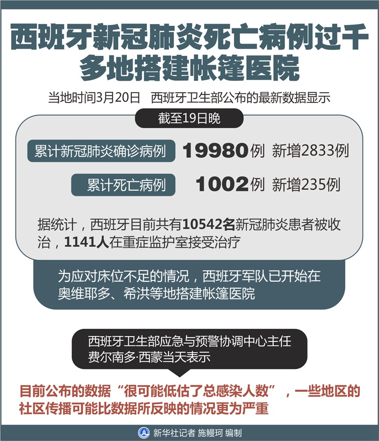 新華社馬德里3月20日電(謝宇智)西班牙衛(wèi)生部20日公布的最新數據顯示,截至19日晚,西班牙累計新冠肺炎確診病例19980例,新增2833例;累計死亡病例1002例,新增235例。