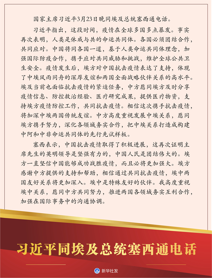 習(xí)近平指出,這段時間,疫情在全球多國多點暴發(fā)。事實再次表明,人類是休戚與共的命運共同體。各國必須團結(jié)合作,共同應(yīng)對。中國將同各國一道,基于人類命運共同體理念,加強國際防疫合作,攜手應(yīng)對共同威脅和挑戰(zhàn),維護全球公共衛(wèi)生安全。疫情發(fā)生后,埃方對中國抗擊疫情表達了支持,體現(xiàn)了中埃風(fēng)雨同舟的深厚友誼和兩國全面戰(zhàn)略伙伴關(guān)系的高水平。埃及當前也面臨抗擊疫情的緊迫任務(wù),中方愿同埃方及時分享疫情信息、防控救治經(jīng)驗、醫(yī)療研究成果,提供醫(yī)療物資,支持埃方疫情防控工作,共同抗擊疫情。相信這次攜手抗擊疫情,將加深中埃兩國傳統(tǒng)友誼。中方高度重視發(fā)展中埃關(guān)系,愿同埃方攜手努力,深化各領(lǐng)域務(wù)實合作,把中埃關(guān)系打造成構(gòu)建中阿和中非命運共同體的先行先試樣板。