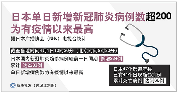 新華社東京4月1日電(記者華義)據(jù)日本廣播協(xié)會(huì)(NHK)電視臺(tái)統(tǒng)計(jì),截至當(dāng)?shù)貢r(shí)間4月1日10時(shí)30分(北京時(shí)間9時(shí)30分),日本國(guó)內(nèi)新冠肺炎確診病例較前一日同期新增234例,累計(jì)達(dá)2233例;單日新增病例數(shù)為有疫情以來最高。
