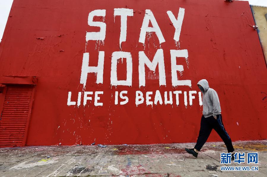 4月9日,一名男子經(jīng)過美國(guó)洛杉磯市區(qū)內(nèi)的防疫主題的壁畫。 為減緩新冠病毒的傳播,洛杉磯市長(zhǎng)7日下令,民眾在公共營(yíng)業(yè)場(chǎng)所要戴口罩或用織物遮擋住臉,這一行政令于2020年4月10日生效。 新華社發(fā)