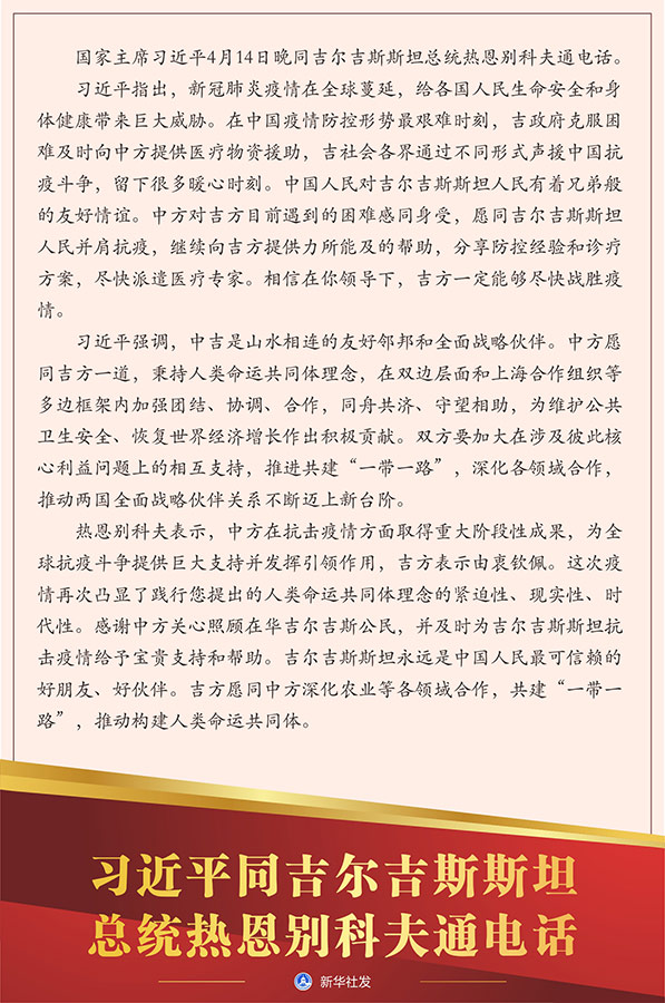 習(xí)近平指出,新冠肺炎疫情在全球蔓延,給各國人民生命安全和身體健康帶來巨大威脅。在中國疫情防控形勢最艱難時(shí)刻,吉政府克服困難及時(shí)向中方提供醫(yī)療物資援助,吉社會(huì)各界通過不同形式聲援中國抗疫斗爭,留下很多暖心時(shí)刻。中國人民對吉爾吉斯斯坦人民有著兄弟般的友好情誼。中方對吉方目前遇到的困難感同身受,愿同吉爾吉斯斯坦人民并肩抗疫,繼續(xù)向吉方提供力所能及的幫助,分享防控經(jīng)驗(yàn)和診療方案,盡快派遣醫(yī)療專家。相信在你領(lǐng)導(dǎo)下,吉方一定能夠盡快戰(zhàn)勝疫情。