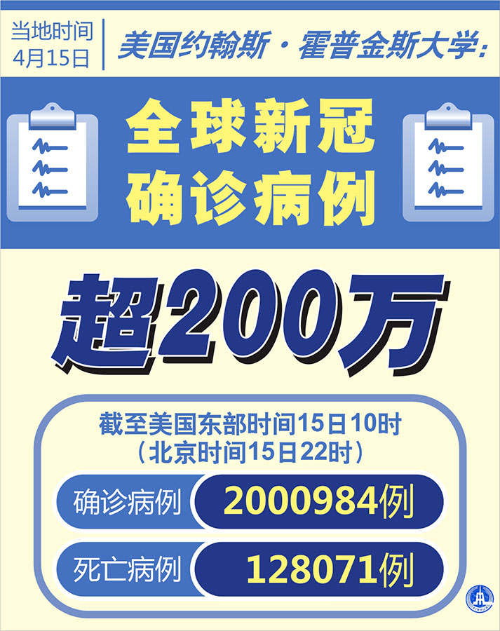 新華社紐約4月15日電 美國(guó)約翰斯·霍普金斯大學(xué)15日發(fā)布的新冠疫情最新統(tǒng)計(jì)數(shù)據(jù)顯示,截至美國(guó)東部時(shí)間15日10時(shí)(北京時(shí)間15日22時(shí)),全球新冠確診病例達(dá)2000984例,死亡病例為128071例。