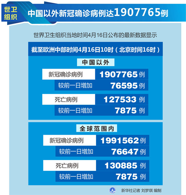 世衛(wèi)組織每日疫情報告顯示,截至歐洲中部時間16日10時(北京時間16時),中國以外新冠確診病例較前一日增加76595例,達到1907765例;中國以外死亡病例較前一日增加7875例,達到127533例。
