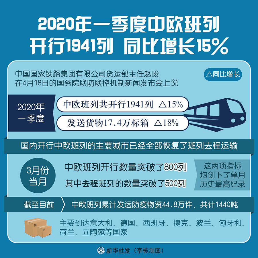 新華社北京4月18日電(記者王希、于文靜)中國國家鐵路集團有限公司貨運部主任趙峻在18日的國務(wù)院聯(lián)防聯(lián)控機制新聞發(fā)布會上說,今年一季度,中歐班列共開行1941列,發(fā)送貨物17.4萬標(biāo)箱,同比分別增長15%和18%。