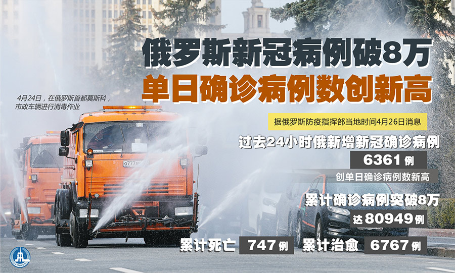 新華社莫斯科4月26日電(記者魯金博)據(jù)俄羅斯防疫指揮部26日消息,過去24小時俄新增新冠確診病例6361例,創(chuàng)單日確診病例數(shù)新高,累計(jì)確診病例突破8萬,達(dá)80949例。