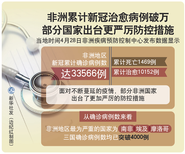 新華社洛美4月28日電 綜合新華社駐非洲地區(qū)記者報道:非洲疾病預防控制中心28日發(fā)布數(shù)據顯示,非洲地區(qū)新冠累計確診病例數(shù)達33566例,累計死亡1469例,累計治愈10152例。面對不斷蔓延的疫情,部分非洲國家出臺了更加嚴厲的防控措施。