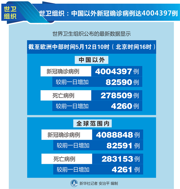 新華社日內(nèi)瓦5月12日電(記者劉曲)世界衛(wèi)生組織12日公布的最新數(shù)據(jù)顯示,中國(guó)以外新冠確診病例達(dá)到4004397例。