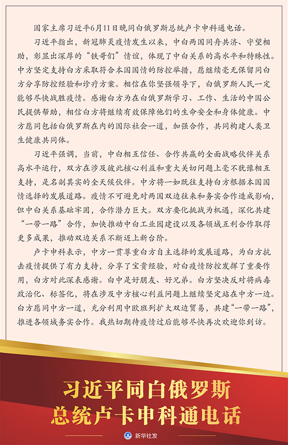 習近平指出,新冠肺炎疫情發(fā)生以來,中白兩國同舟共濟、守望相助,彰顯出深厚的“鐵哥們”情誼,體現(xiàn)了中白關系的高水平和特殊性。中方堅定支持白方采取符合本國國情的防控舉措,愿繼續(xù)毫無保留同白方分享防控經驗和診療方案。相信在你堅強領導下,白俄羅斯人民一定能夠盡快戰(zhàn)勝疫情。感謝白方為在白俄羅斯學習、工作、生活的中國公民提供幫助,相信白方將繼續(xù)有效保障他們的生命安全和身體健康。中方愿同包括白俄羅斯在內的國際社會一道,加強合作,共同構建人類衛(wèi)生健康共同體。