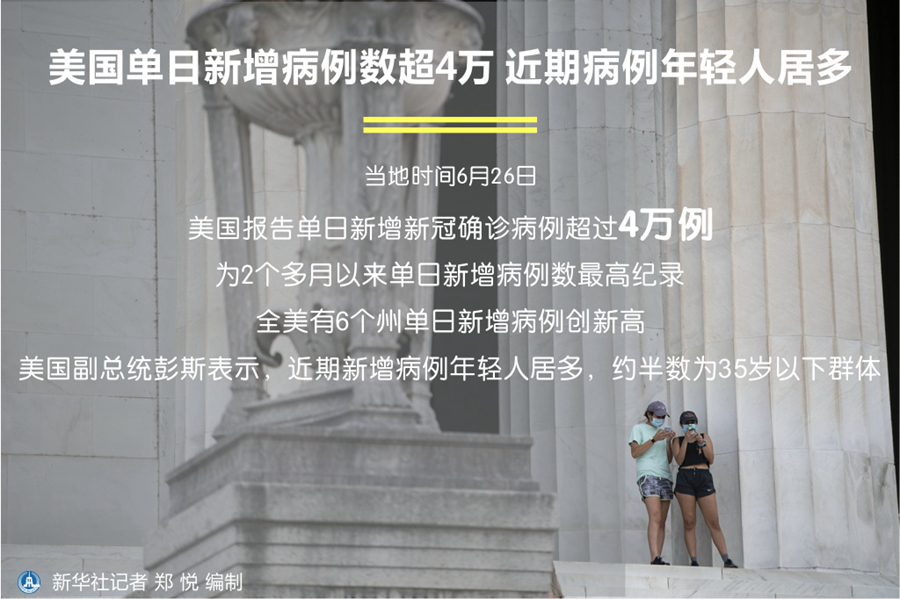 新華社華盛頓6月26日電(記者譚晶晶)美國26日?qǐng)?bào)告單日新增新冠確診病例超過4萬例,為2個(gè)多月以來單日新增病例數(shù)最高紀(jì)錄。全美有6個(gè)州單日新增病例創(chuàng)新高。美國副總統(tǒng)彭斯表示,近期新增病例年輕人居多,約半數(shù)為35歲以下群體。