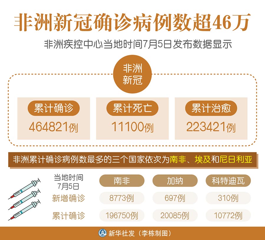 新華社阿比讓7月5日電 綜合新華社駐非洲地區(qū)記者報道:非洲疾控中心5日發(fā)布數據顯示,非洲累計新冠確診病例達464821例,累計死亡11100例,累計治愈223421例。
