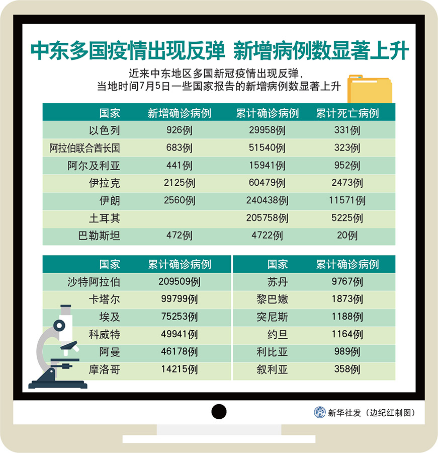 新華社喀土穆7月5日電 綜合新華社駐中東地區(qū)記者報道:近來中東地區(qū)多國新冠疫情出現反彈,一些國家5日報告的新增病例數顯著上升,多國政府敦促民眾嚴格落實防控措施。