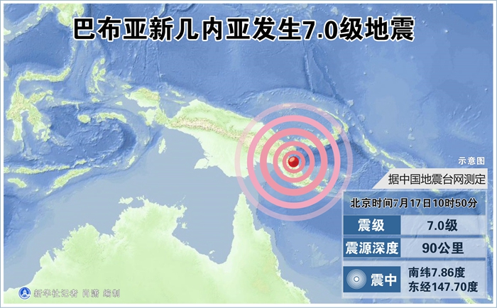 新華社快訊:中國地震臺網(wǎng)正式測定:7月17日10時50分在巴布亞新幾內(nèi)亞(南緯7.86度,東經(jīng)147.70度)發(fā)生7.0級地震,震源深度90千米。
