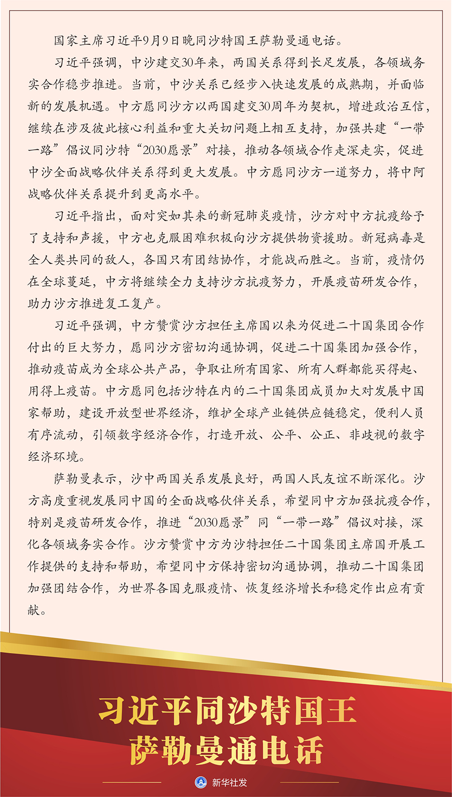 新華社北京9月9日電? 國家主席習(xí)近平9月9日晚同沙特國王薩勒曼通電話。