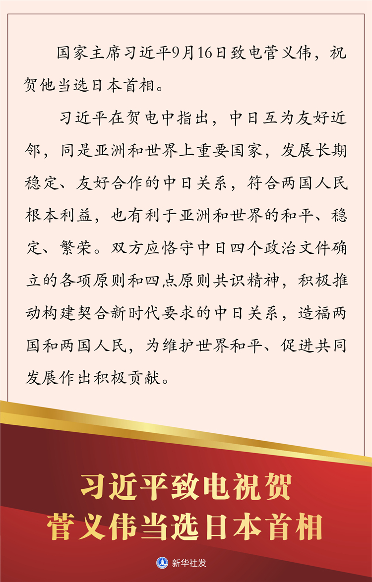 新華社北京9月16日電 國家主席習(xí)近平今天致電菅義偉,祝賀他當(dāng)選日本首相。