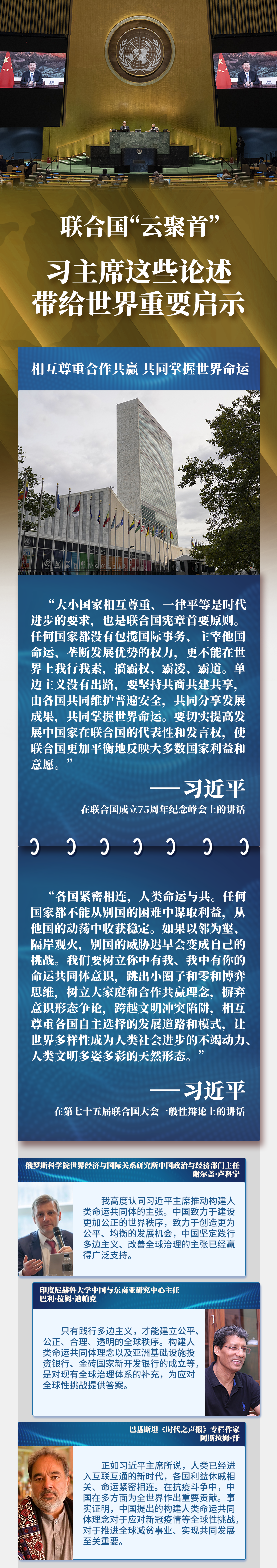 在聯(lián)合國(guó)成立75周年之際,習(xí)主席通過(guò)視頻方式,在聯(lián)合國(guó)這一多邊外交舞臺(tái)闡述關(guān)于國(guó)際秩序和人類前途命運(yùn)的中國(guó)主張,為國(guó)際社會(huì)應(yīng)對(duì)全球性挑戰(zhàn)、推動(dòng)共同發(fā)展指明方向,為世界各國(guó)攜手構(gòu)建人類命運(yùn)共同體、共創(chuàng)更加美好的未來(lái)注入信心和動(dòng)力——