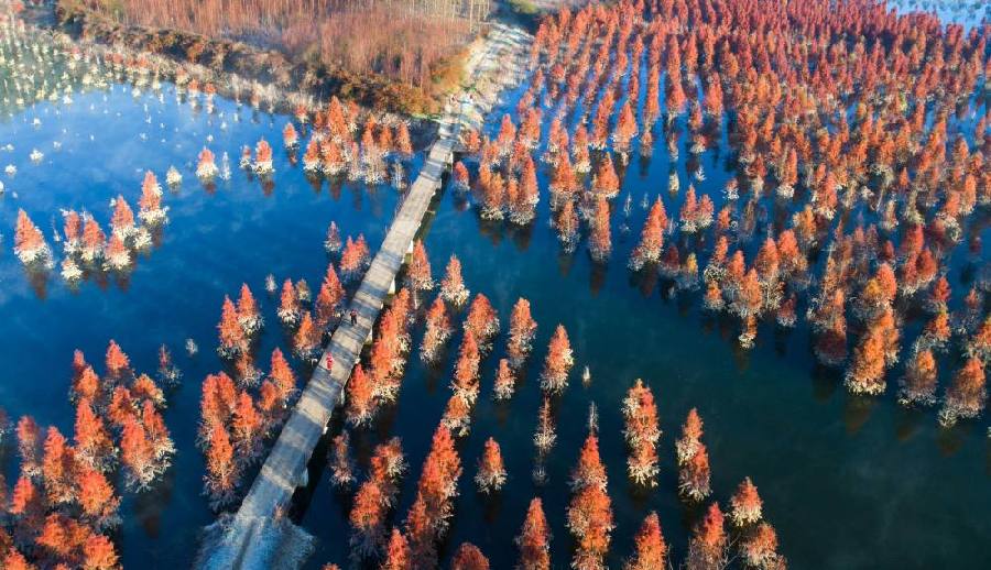 云南昆明水杉濕地冬日一景(2019年1月5日攝,無(wú)人機(jī)照片)。新華社記者 秦晴 攝