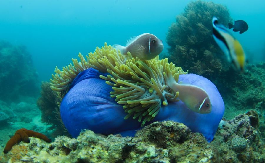 這是2020年5月28日在中國(guó)海南三亞蜈支洲島海域拍攝的與??采男〕篝~(yú)。新華社記者 楊冠宇 攝