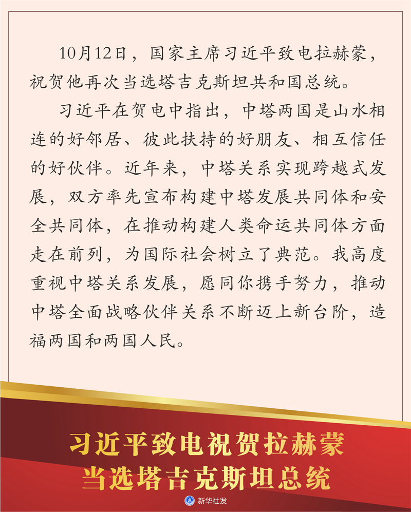 新華社北京10月12日電 10月12日,國(guó)家主席習(xí)近平致電拉赫蒙,祝賀他再次當(dāng)選塔吉克斯坦共和國(guó)總統(tǒng)。