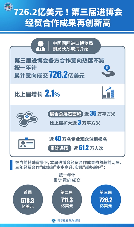 圖表:726.2億美元!第三屆進(jìn)博會經(jīng)貿(mào)合作成果再創(chuàng)新高 新華社發(fā) 陳為 編制